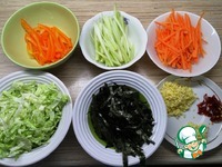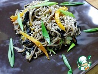 Перемешать и через минуту снять с плиты. Переложить к овощам лапшу и добавить нори. Перемешать и оставить постоять пару минут. |