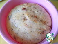 Влейте теплую воду и замесите не тугое тесто. Выложите тесто в емкость, прикройте пищевой пленкой - пусть оно поднимается. |