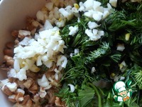 Зелень вымыть, нарезать, чеснок порубить. Отправить в миску с баклажанами, тофу и орехами. У помидоров срезать шляпки, вынуть мякоть, нарезать ее и отправить в миску с начинкой. |