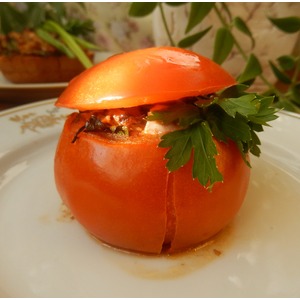 Описание: Ароматные помидорки, фаршированные баклажаном с зеленью и тофу. Отличная горячая закуска. Так же хороши в виде основного блюда с гарниром из жареного картофеля.