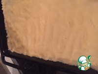 Смасленный противень застилаем приготовленной нами основой и в разогретую духовку ( 180 ) на 15 минут. |