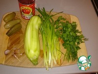 Наши ингредиенты для начинки. С цукини снял кожуру. Огурцы маринованные собственного изготовления из парника тестя. |