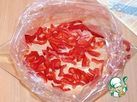 Нагрейте духовку до 200 °С. Отрежьте рукав для запекания. Положите в него кусочки запеченного перца, |