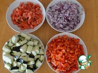 4. Лук, 400 г помидоров и чеснок мелко порубить. Перец нарезать небольшими кубиками, а баклажан – средними. Кориандр растолочь в ступке в порошок. |