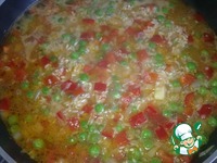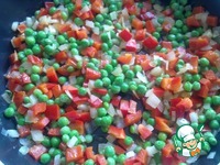 Добавляем зелёный горошек и обжариваем всё вместе ещё 3 минуты. |