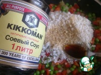 Теперь добавляем тщательно промытый рис. Заливаем всё соевым соусом и перемешиваем. Солить не нужно! В соевом соусе достаточно соли. |