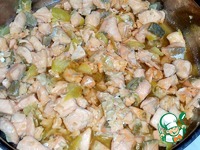 Пока фасоль готовилась в мультиварке, я занялась лососем. Лосось нарезала кубиками, посолила и обжарила с луком в разогретой сковороде на оливковом масле. |