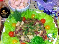 Описание: Вкусное блюдо из трёх видов фасоли и лосось, жаренный на оливковом масле с луком.