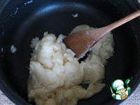 Добавить муку, снять с огня и хорошо перемешать ингредиенты. Должен получиться колобок. Поставить ещё раз на огонь и, постоянно перемешивая, подержать 2 минуты, снять с огня и дать остыть. |