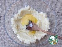 Когда тесто полностью остыло, добавить 1 яйцо и хорошо перемешать и только потом добавить второе яйцо, перемешать и добавить третье, перемешать и добавить четвёртое. |