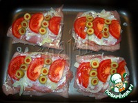 В промежутки между помидорками выложить оливки, разрезанные пополам. |