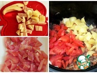 Режем перец и помидор кубиками. В мультиварке ставим режим "Жарить" еще на 10-15 минут и отправляем помидоры и перец к грибам. Готовим до конца программы. |
