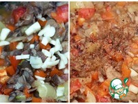 Тем временем режем кубиками лук и морковь, и отправляем к грибам. В мультиварке готовим до конца программы. Обязательно помешиваем. |