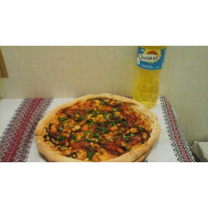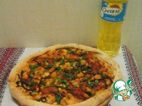 Закладываем начинку. Поливаем соусом. Бортики смазываем маслицом ТМ Олейна. Ставим в духовку на самый низ на 15 минут в зависимости от Вашей духовки))) |