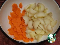 Свеклу, морковь и картофель отварить, охладить и очистить. Нарезать тонкими ломтиками. В миску выложить картофель с морковью. |