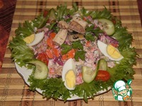 Плоскую тарелку застелить листьями зеленого салата, выложить салат, украсить дольками яиц, свежим огурцом и зеленым луком. |