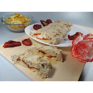 Перец запекаем в духовке при 200 градусах Цельсия до черных подпалин, немного остужаем, очищаем, режем на полоски и снимаем кожуру. Сыр режем длинными полосками. Выкладываем на середину рулета очищенный перец и сыр в шахматном порядке. Если хотите сделать рулет еще более диетическим, можете поменять начинку по собственному усмотрению. Накрываем начинку свободными краями рулета, начинка должна быть полностью им покрыта. Оборачиваем рулет фольгой, придавая ему форму и ставим в разогретую до 180 гр. Цельсия духовку на 30 минут, после чего достаем рулет из духовки, разворачиваем фольгу и смазываем верх 1 неполной ст. л. растительного масла. |