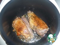 Каждый кусок гуся вытереть насухо бумажными полотенцами, на дно чаши мультиварки налить раст масло и обжаривать на максимальной температуре до золотистой корочки каждый кусок |