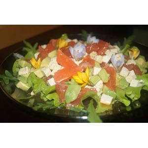 Перемешать грейпфрут с авокадо и тофу, затем выложить на листья салата и заправить соусом. Я украсила салат крокусами, чтобы весна была и на столе! |