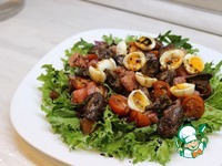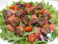 Добавляем к нашему салату... Полить все немного соком грейпфрута и маслом, на котором жарилась печень. |