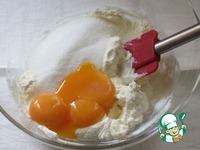 Перетереть ложкой рикотту, добавить желтки и сахар, всё хорошо перемешать. |