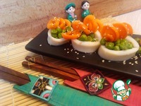 Или укладываем кольца вертикально и в них кладем овощи. Также посыпаем кунжутом |
