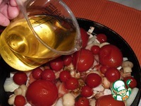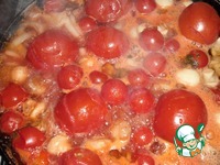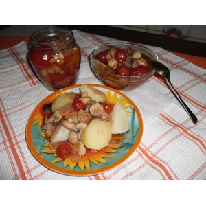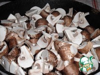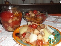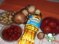 Итак, вот ингредиенты. Думаю, вместо шампиньонов вполне можно взять другие лесные грибы. В оригинальном рецепте были всякие подберезовики-подоси новики-сыроежки, собственноручно замаринованные и томаты в собственном соку. У нас такой роскоши нет, поэтому к маринованным шампиньонам добавила свежих (королевские, коричневые) и немного маринованных черри. Если хотите более диетический вариант, маринованные черри можно пропустить. Хотя в итоге у меня получилось не слишком остро, а в самый раз (с учетом моей нелюбви к острым блюдам). Лука можно по желанию даже побольше взять, он лишним не будет. |
