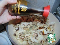 Нарезанные грибы отправить на сковородку с луком, добавить соевый соус Kikkoman, перемешать и жарить 5 минут. |