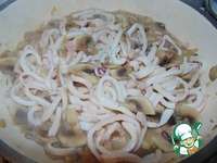 Кальмары нарезать кольцами и выложить в сковороду. |