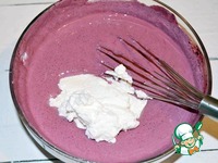 В отдельной посуде взбиваем сливки до устойчивых пик и тоже подмешиваем к нашему черничному муссу. Отправляем в холодильник для легкого загустевания. |