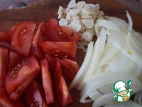 Лук нарезать полукольцами, чеснок пластинками, а помидоры дольками. |