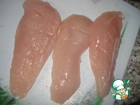 С куриной грудки снять кожу, отделить от кости и нарезать на вот такие пластинки. На каждой пластинке сделать ножом несколько надрезов. |