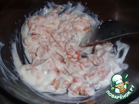 Для соуса смешать 2 ст. л. майонеза и 1 ст. л. красной икры. Забыла, что икра вчера ушла в другой салат. Мелко нарезала красную рыбу, чем не икра. |