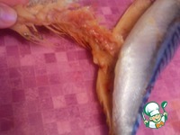 РАЗДЕЛКА. Скумбрию потрошим, голову отрезаем. Ножом помогая себе, вытаскиваем хребет и реберные косточки |