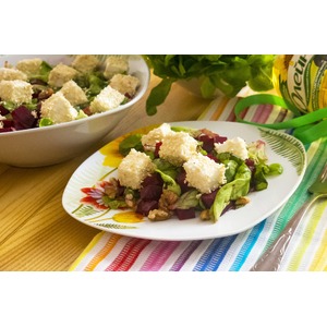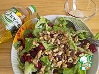 Затем добавляем свеклу, грецкие орехи и снова аккуратно перемешиваем. Можно слегка (!!) посолить, но осторожно, т. к. в салате будет соленая брынза. |