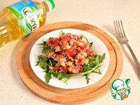 Теперь сервируем порционно салат на тарелки. Положить горсть рукколы, а сверху выложить приготовленный салат. Можно еще дополнительно по желанию сбрызнуть маслом. |