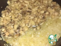 Отодвигаем лук к краю сковороды и добавляем грибы, солим. Слегка обжариваем. Это для того, чтобы грибной сок пропитал лук. Тем временем на мелкой терке трем морковь. |