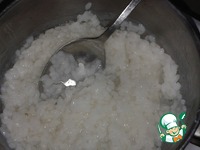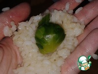 Мокрыми руками взять по столовой ложке риса, в серединку положить капусту |
