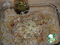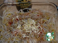 Дав немного остыть проросткам, выкладываем их в чашку, где будем готовить салат, поливаем маринадом и сверху кладем соломкой нарезанный чеснок |