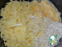 Смешать тёртые овощи в миске, выдавленный через чеснокодавилку чеснок и слегка взбитые яйца. Посолить, поперчить, перемешать и добавить муку. |