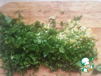 Когда морковь с луком поджарятся добавить к ним зелень и измельченный чеснок. Я вместо чеснока положила черемшу. Поперчить. Обжаривать далее не более 2 мин чтобы не пропал аромат свежей зелени. |