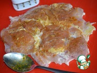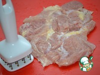Для этого блюда я беру готовое куриное бедро без кости, оно имеет вот такую кругло-овальную форму, что очень удобно использовать для приготовления любых блюд. С помощью тендерайзера отбиваем мясо. |