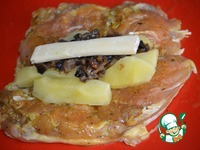 Начинаем фаршировать мясо. Кладем бруски картофеля, грибы и сверху брусочек сыра. |