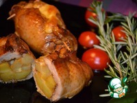 Описание: Очень вкусное и полноценное второе блюдо, гарнир и горячее в одном "флаконе". Сочная и ароматная курица заключает в себе трио из брусочков картофеля, шампиньонов и маложирного сыра.