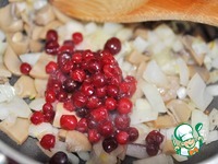 На сковороду наливаем растительное масло и обжариваем (пассеруем) грибы с луком 5 минут. Добавляем бруснику (половину), свежемолотый чёрный перец, перемешиваем. |