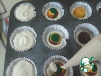 Получившиеся бисквитные шарики остудить. В форму для маффинов выложить бумажные капсулы и положить по 1 ст. л. белого теста, сверху выложить цветные шарики и слегка притопить их. |