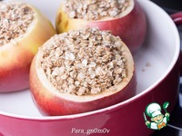 7. Выложить хлопья на яблоки в виде шапочки. Запекать в разогретой до 180 градусов духовке около 25 минут до мягкости яблок. Хлопья должны стать чуть золотистыми и хрустящими. |