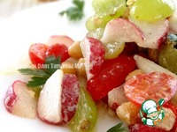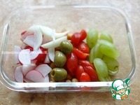 Виноград и томаты порезать вдоль, добавить нут, и резанный редис; |