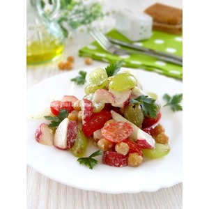 Описание: Очень вкусный, быстрого приготовления, полезный салатик с нутом, виноградом и овощами с виноградным маслом и оливками!