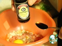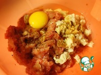 У меня фарш из куриных бедрышек. Добавляем к нему яйцо, перец свежемолотый, ломтик хлеба размоченный в воде. |